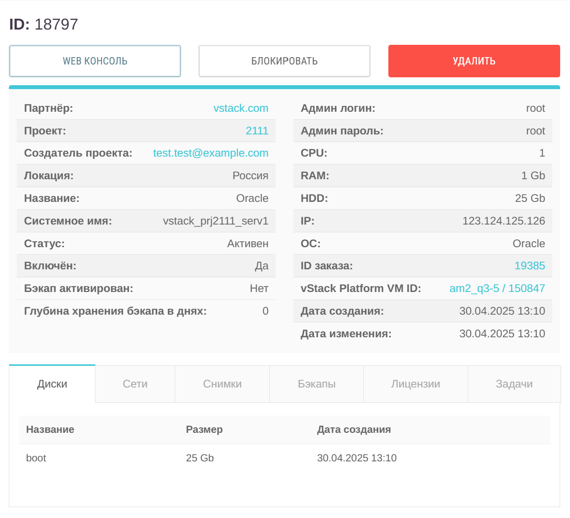 В центральной части карточки содержится информация о партнёре, номере проекта, в котором она была создана, почта создателя проекта, локация сервера, название ВМ, ее системное имя, статус (Активен, Блокирован админом, Блокирован по балансу и т.д.) и ее состояние. Также здесь вы можете посмотреть логин и пароль администратора, количество CPU, RAM, HDD, IP-адрес виртуальной машины, ее операционную систему, ID заказа, ID виртуальной машины на платформе vStack (при нажатии в новой вкладке будет открыта нужная ВМ), дату ее создания и изменения.